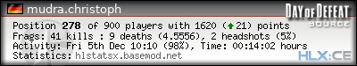 | Rank | Server | Kills | % | Ratio | Deaths | K:D | Headshots | Percentage of Headshots | % | HS:K |