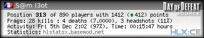 | Rank | Server | Kills | % | Ratio | Deaths | K:D | Headshots | Percentage of Headshots | % | HS:K |
