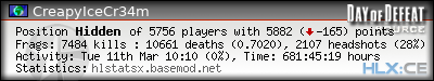 | Rank | Server | Kills | % | Ratio | Deaths | K:D | Headshots | Percentage of Headshots | % | HS:K |