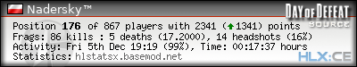 | Rank | Server | Kills | % | Ratio | Deaths | K:D | Headshots | Percentage of Headshots | % | HS:K |
