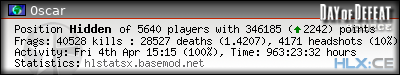 | Rank | Server | Kills | % | Ratio | Deaths | K:D | Headshots | Percentage of Headshots | % | HS:K |