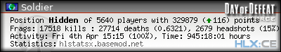 | Rank | Server | Kills | % | Ratio | Deaths | K:D | Headshots | Percentage of Headshots | % | HS:K |