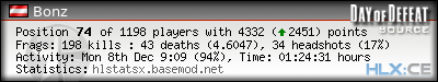 | Rank | Server | Kills | % | Ratio | Deaths | K:D | Headshots | Percentage of Headshots | % | HS:K |