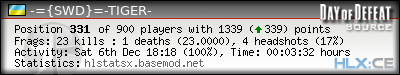 | Rank | Server | Kills | % | Ratio | Deaths | K:D | Headshots | Percentage of Headshots | % | HS:K |