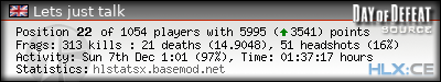| Rank | Server | Kills | % | Ratio | Deaths | K:D | Headshots | Percentage of Headshots | % | HS:K |
