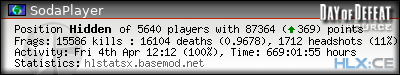 | Rank | Server | Kills | % | Ratio | Deaths | K:D | Headshots | Percentage of Headshots | % | HS:K |