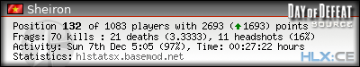 | Rank | Server | Kills | % | Ratio | Deaths | K:D | Headshots | Percentage of Headshots | % | HS:K |