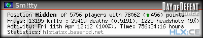 | Rank | Server | Kills | % | Ratio | Deaths | K:D | Headshots | Percentage of Headshots | % | HS:K |