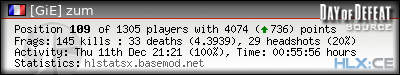 | Rank | Server | Kills | % | Ratio | Deaths | K:D | Headshots | Percentage of Headshots | % | HS:K |