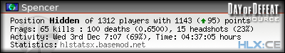 | Rank | Server | Kills | % | Ratio | Deaths | K:D | Headshots | Percentage of Headshots | % | HS:K |