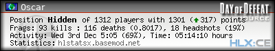 | Rank | Server | Kills | % | Ratio | Deaths | K:D | Headshots | Percentage of Headshots | % | HS:K |