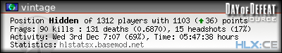 | Rank | Server | Kills | % | Ratio | Deaths | K:D | Headshots | Percentage of Headshots | % | HS:K |
