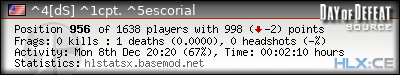 | Rank | Map | Kills | % | Ratio | Deaths | % | Ratio | K:D | Headshots | % | Ratio | HS:K |
