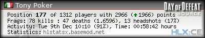 | Rank | Server | Kills | % | Ratio | Deaths | K:D | Headshots | Percentage of Headshots | % | HS:K |