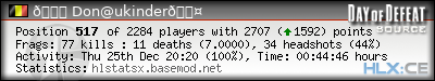 | Rank | Name | Time | Last Use | Kills | Deaths | K:D | Headshots | HS:K | Suicides | Accuracy |