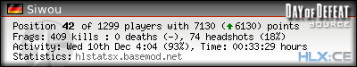 | Rank | Server | Kills | % | Ratio | Deaths | K:D | Headshots | Percentage of Headshots | % | HS:K |