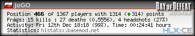 | Rank | Map | Kills | % | Ratio | Deaths | % | Ratio | K:D | Headshots | % | Ratio | HS:K |