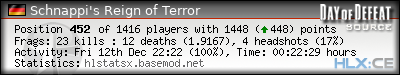 | Rank | Server | Kills | % | Ratio | Deaths | K:D | Headshots | Percentage of Headshots | % | HS:K |