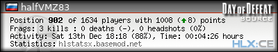| Rank | Map | Kills | % | Ratio | Deaths | % | Ratio | K:D | Headshots | % | Ratio | HS:K |