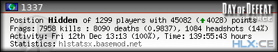 | Rank | Server | Kills | % | Ratio | Deaths | K:D | Headshots | Percentage of Headshots | % | HS:K |