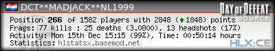| Rank | Server | Kills | % | Ratio | Deaths | K:D | Headshots | Percentage of Headshots | % | HS:K |
