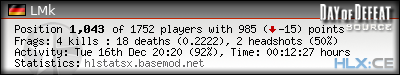 | Rank | Map | Kills | % | Ratio | Deaths | % | Ratio | K:D | Headshots | % | Ratio | HS:K |