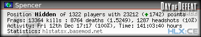 | Rank | Server | Kills | % | Ratio | Deaths | K:D | Headshots | Percentage of Headshots | % | HS:K |