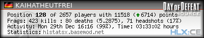 | Rank | Server | Kills | % | Ratio | Deaths | K:D | Headshots | Percentage of Headshots | % | HS:K |