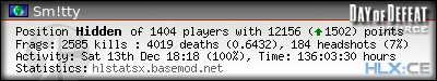 | Rank | Server | Kills | % | Ratio | Deaths | K:D | Headshots | Percentage of Headshots | % | HS:K |