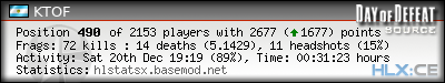 | Rank | Server | Kills | % | Ratio | Deaths | K:D | Headshots | Percentage of Headshots | % | HS:K |