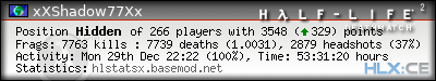 | Rank | Server | Kills | % | Ratio | Deaths | K:D | Headshots | Percentage of Headshots | % | HS:K |