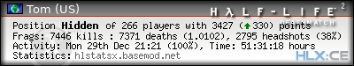 | Rank | Server | Kills | % | Ratio | Deaths | K:D | Headshots | Percentage of Headshots | % | HS:K |