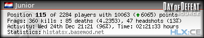| Rank | Server | Kills | % | Ratio | Deaths | K:D | Headshots | Percentage of Headshots | % | HS:K |