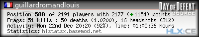 | Rank | Server | Kills | % | Ratio | Deaths | K:D | Headshots | Percentage of Headshots | % | HS:K |