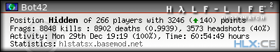 | Rank | Server | Kills | % | Ratio | Deaths | K:D | Headshots | Percentage of Headshots | % | HS:K |
