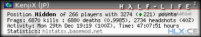 | Rank | Server | Kills | % | Ratio | Deaths | K:D | Headshots | Percentage of Headshots | % | HS:K |