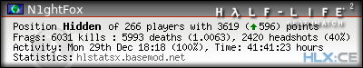 | Rank | Server | Kills | % | Ratio | Deaths | K:D | Headshots | Percentage of Headshots | % | HS:K |
