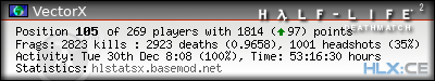 | Rank | Server | Kills | % | Ratio | Deaths | K:D | Headshots | Percentage of Headshots | % | HS:K |