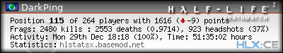 | Rank | Server | Kills | % | Ratio | Deaths | K:D | Headshots | Percentage of Headshots | % | HS:K |