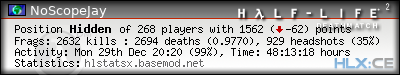 | Rank | Server | Kills | % | Ratio | Deaths | K:D | Headshots | Percentage of Headshots | % | HS:K |