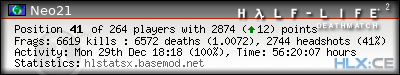 | Rank | Server | Kills | % | Ratio | Deaths | K:D | Headshots | Percentage of Headshots | % | HS:K |