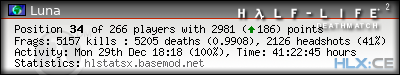 | Rank | Server | Kills | % | Ratio | Deaths | K:D | Headshots | Percentage of Headshots | % | HS:K |