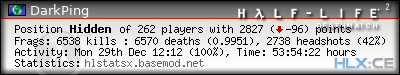 | Rank | Server | Kills | % | Ratio | Deaths | K:D | Headshots | Percentage of Headshots | % | HS:K |