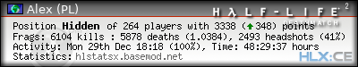 | Rank | Server | Kills | % | Ratio | Deaths | K:D | Headshots | Percentage of Headshots | % | HS:K |