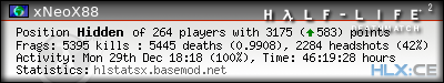 | Rank | Server | Kills | % | Ratio | Deaths | K:D | Headshots | Percentage of Headshots | % | HS:K |