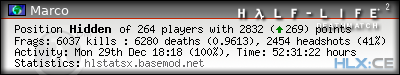 | Rank | Server | Kills | % | Ratio | Deaths | K:D | Headshots | Percentage of Headshots | % | HS:K |