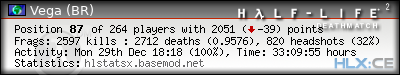 | Rank | Server | Kills | % | Ratio | Deaths | K:D | Headshots | Percentage of Headshots | % | HS:K |
