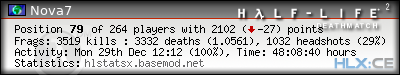 | Rank | Server | Kills | % | Ratio | Deaths | K:D | Headshots | Percentage of Headshots | % | HS:K |