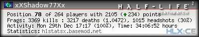 | Rank | Server | Kills | % | Ratio | Deaths | K:D | Headshots | Percentage of Headshots | % | HS:K |