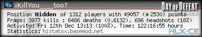 | Rank | Server | Kills | % | Ratio | Deaths | K:D | Headshots | Percentage of Headshots | % | HS:K |